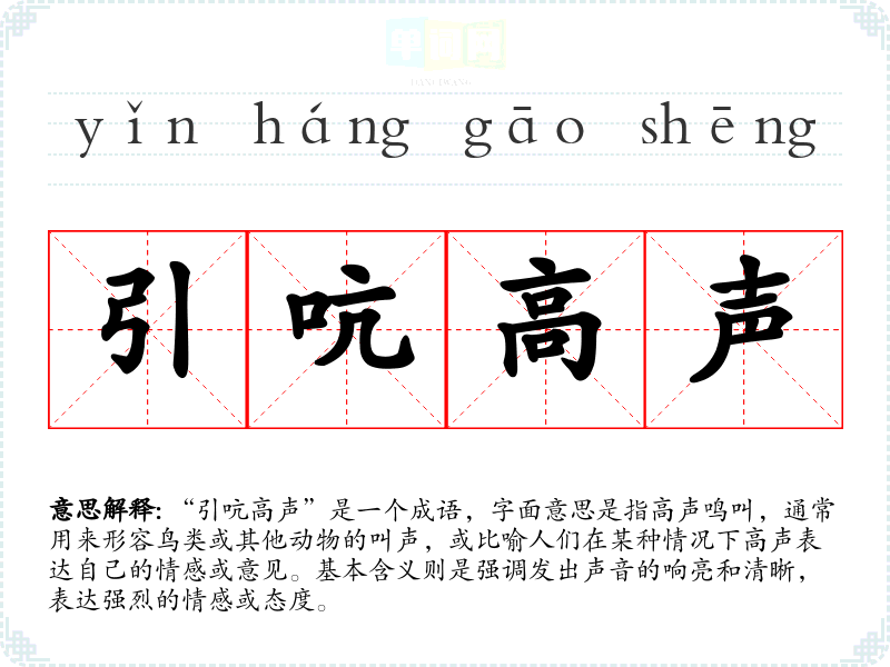“引吭高声”是一个成语,字面意思是指高声鸣叫,通常用来形容鸟类或其他动物的叫声,或比喻人们在某种情况下高声表达自己的情感或意见。基本含义则是强调发出声音的响亮和清晰,表达强烈的情感或态度。