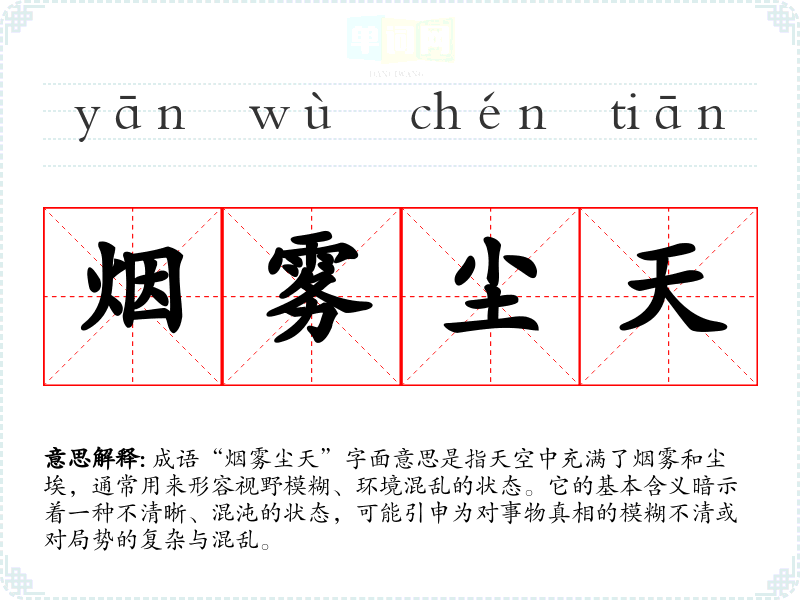 成语“烟雾尘天”字面意思是指天空中充满了烟雾和尘埃,通常用来形容视野模糊、环境混乱的状态。它的基本含义暗示着一种不清晰、混沌的状态,可能引申为对事物真相的模糊不清或对局势的复杂与混乱。