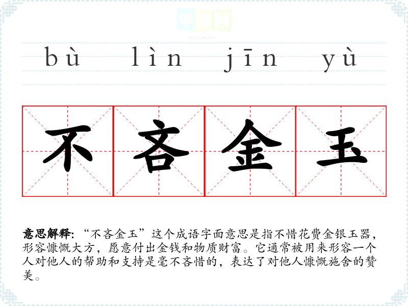 “不吝金玉”这个成语字面意思是指不惜花费金银玉器,形容慷慨大方,愿意付出金钱和物质财富。它通常被用来形容一个人对他人的帮助和支持是毫不吝惜的,表达了对他人慷慨施舍的赞美。
