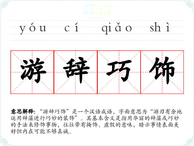“游辞巧饰”是一个汉语成语,字面意思为“游刃有余地运用辞藻进行巧妙的装饰”。其基本含义是指用华丽的辞藻或巧妙的手法来修饰事物,往往带有掩饰、虚假的意味,暗示事情表面美好但内在可能不够真诚。