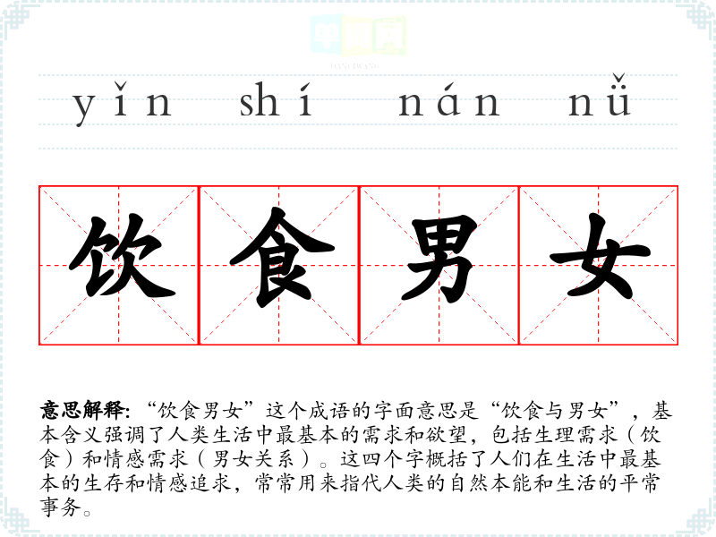 “饮食男女”这个成语的字面意思是“饮食与男女”,基本含义强调了人类生活中最基本的需求和欲望,包括生理需求(饮食)和情感需求(男女关系)。这四个字概括了人们在生活中最基本的生存和情感追求,常常用来指代人类的自然本能和生活的平常事务。