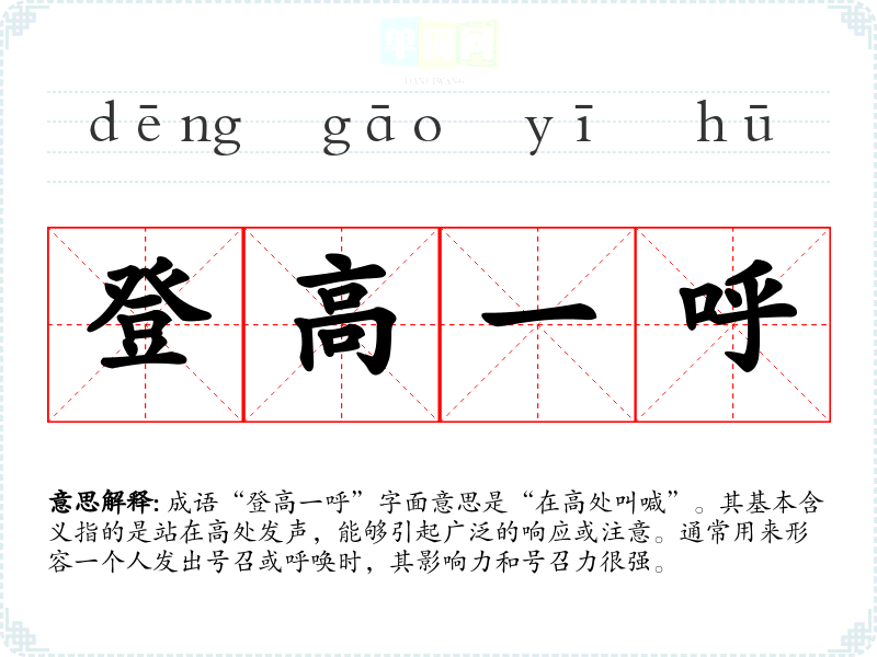 成语“登高一呼”字面意思是“在高处叫喊”。其基本含义指的是站在高处发声,能够引起广泛的响应或注意。通常用来形容一个人发出号召或呼唤时,其影响力和号召力很强。