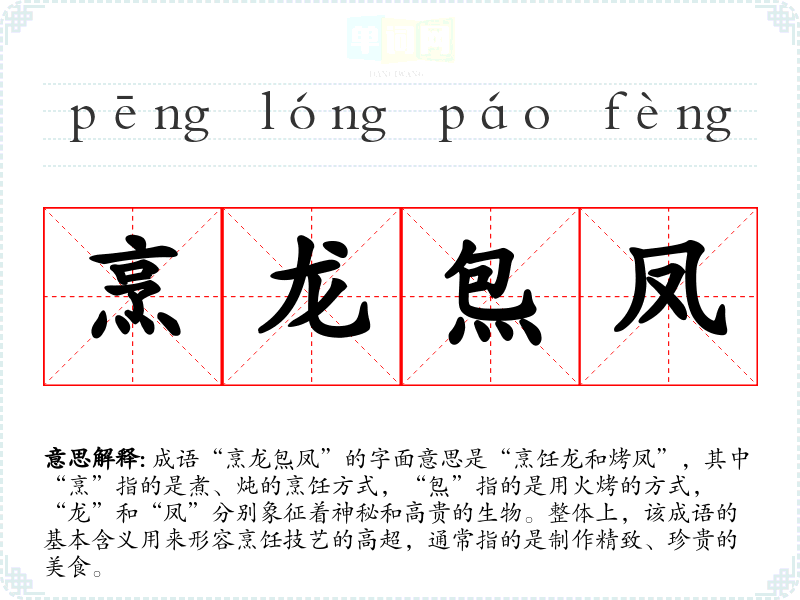 成语“烹龙炰凤”的字面意思是“烹饪龙和烤凤”,其中“烹”指的是煮、炖的烹饪方式,“炰”指的是用火烤的方式,“龙”和“凤”分别象征着神秘和高贵的生物。整体上,该成语的基本含义用来形容烹饪技艺的高超,通常指的是制作精致、珍贵的美食。