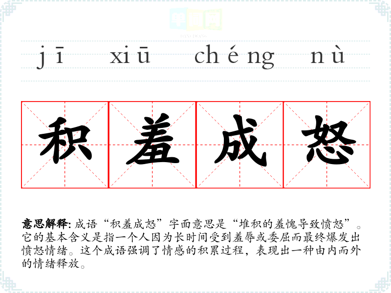 成语“积羞成怒”字面意思是“堆积的羞愧导致愤怒”。它的基本含义是指一个人因为长时间受到羞辱或委屈而最终爆发出愤怒情绪。这个成语强调了情感的积累过程,表现出一种由内而外的情绪释放。