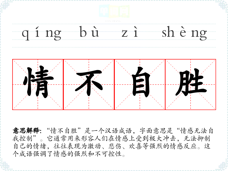 - 反义成语:如“心如止水”、“淡然处之”,表示一种内心的平静和冷静,正好与“情不自胜”的情感激动形成对比。