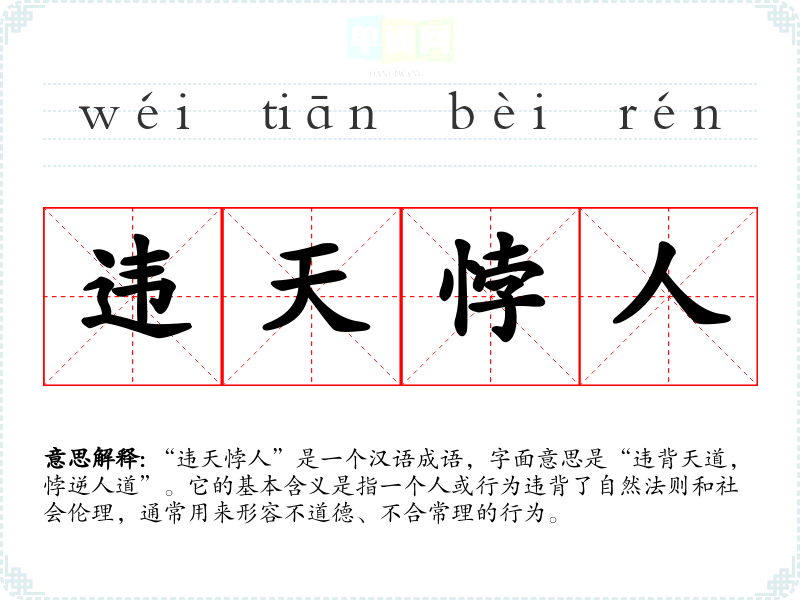 “违天悖人”是一个汉语成语,字面意思是“违背天道,悖逆人道”。它的基本含义是指一个人或行为违背了自然法则和社会伦理,通常用来形容不道德、不合常理的行为。
