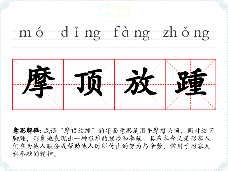 成语“摩顶放踵”的字面意思是用手摩擦头顶,同时放下脚踵,形象地表现出一种艰难的跋涉和奉献。其基本含义是形容人们在为他人服务或帮助他人时所付出的努力与辛劳,常用于形容无私奉献的精神。