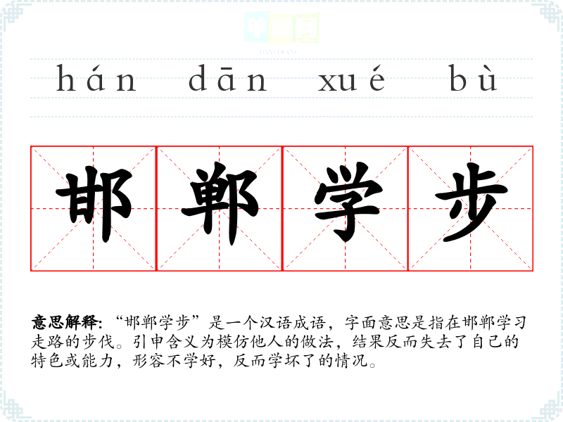 “邯郸学步”是一个汉语成语,字面意思是指在邯郸学习走路的步伐。引申含义为模仿他人的做法,结果反而失去了自己的特色或能力,形容不学好,反而学坏了的情况。