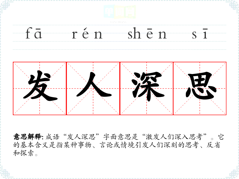 成语“发人深思”字面意思是“激发人们深入思考”。它的基本含义是指某种事物、言论或情境引发人们深刻的思考、反省和探索。