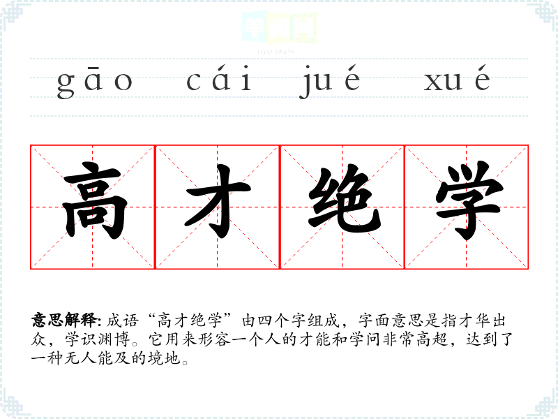成语“高才绝学”由四个字组成,字面意思是指才华出众,学识渊博。它用来形容一个人的才能和学问非常高超,达到了一种无人能及的境地。