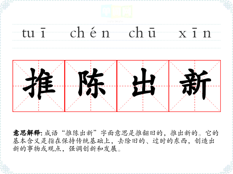 成语“推陈出新”字面意思是推翻旧的,推出新的。它的基本含义是指在保持传统基础上,去除旧的、过时的东西,创造出新的事物或观点,强调创新和发展。