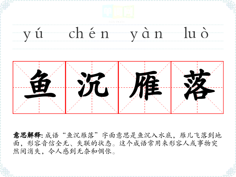 在我的生活中,有一次和朋友失去联系,几个月没有音信,心中难免惆怅。在某次聚会时提到她,大家都感慨“鱼沉雁落”,这个成语正好捕捉了我当时的心情,表达了对她的关心和思念。