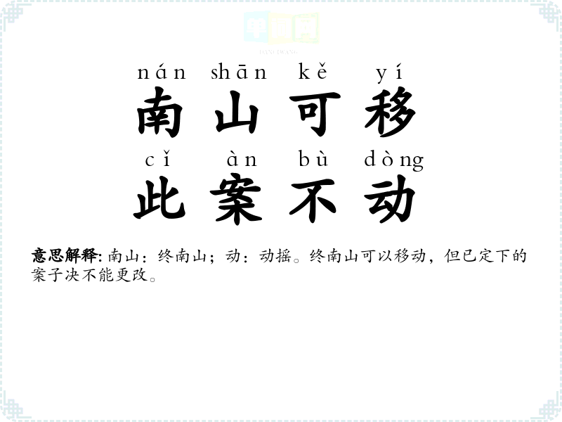 | 南山可移,此案不动 | 南山:终南山;动:动摇。终南山可以移动,但已定下的案子决不能更改。 |