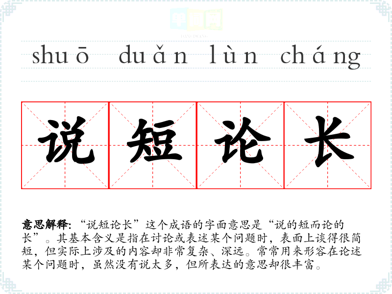 “说短论长”这个成语的字面意思是“说的短而论的长”。其基本含义是指在讨论或表述某个问题时,表面上谈得很简短,但实际上涉及的内容却非常复杂、深远。常常用来形容在论述某个问题时,虽然没有说太多,但所表达的意思却很丰富。