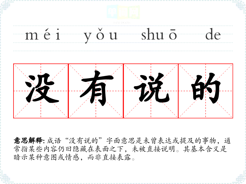成语“没有说的”字面意思是未曾表达或提及的事物,通常指某些内容仍旧隐藏在表面之下,未被直接说明。其基本含义是暗示某种意图或情感,而非直接表露。