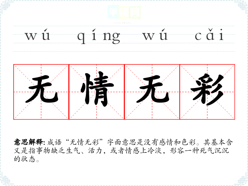 成语“无情无彩”字面意思是没有感情和色彩。其基本含义是指事物缺乏生气、活力,或者情感上冷淡,形容一种死气沉沉的状态。