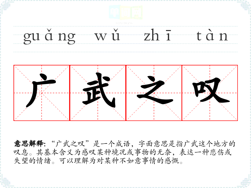 “广武之叹”出自《左传》。传说在春秋时期,晋国的广武君因国家的危难而感到忧虑,发出叹息。这种叹息不仅是对自己处境的无奈,也反映了对国家前途的担忧,因此“广武之叹”逐渐演变为一种对国家、社会或个人命运感叹的象征。
