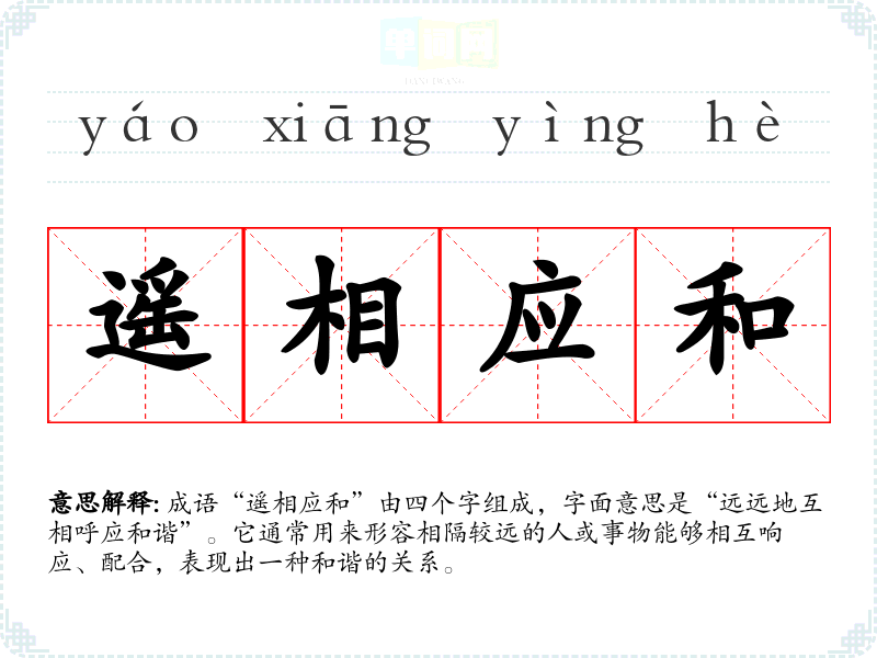 成语“遥相应和”由四个字组成,字面意思是“远远地互相呼应和谐”。它通常用来形容相隔较远的人或事物能够相互响应、配合,表现出一种和谐的关系。
