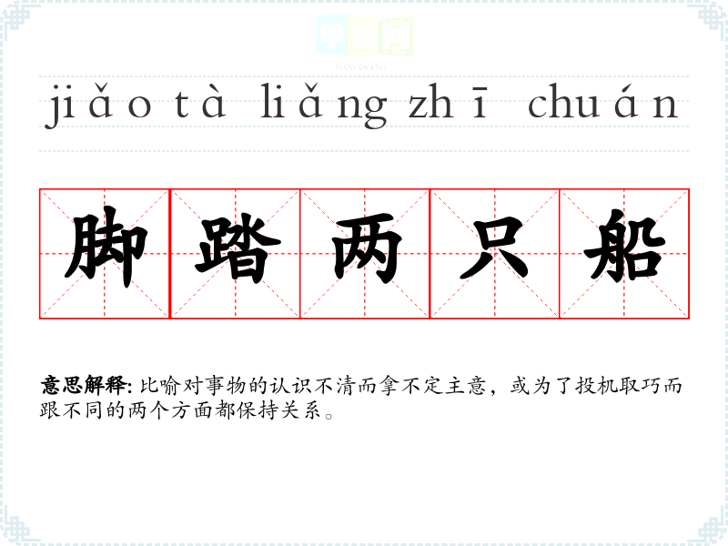 | 脚踏两只船 | 比喻对事物的认识不清而拿不定主意,或为了投机取巧而跟不同的两个方面都保持关系。 |