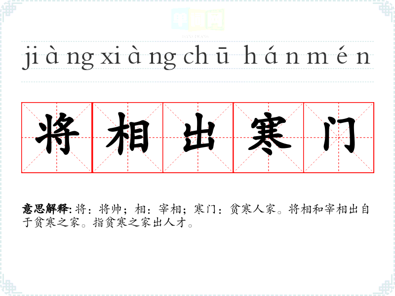 将:将帅;相:宰相;寒门:贫寒人家。将相和宰相出自于贫寒之家。指贫寒之家出人才。