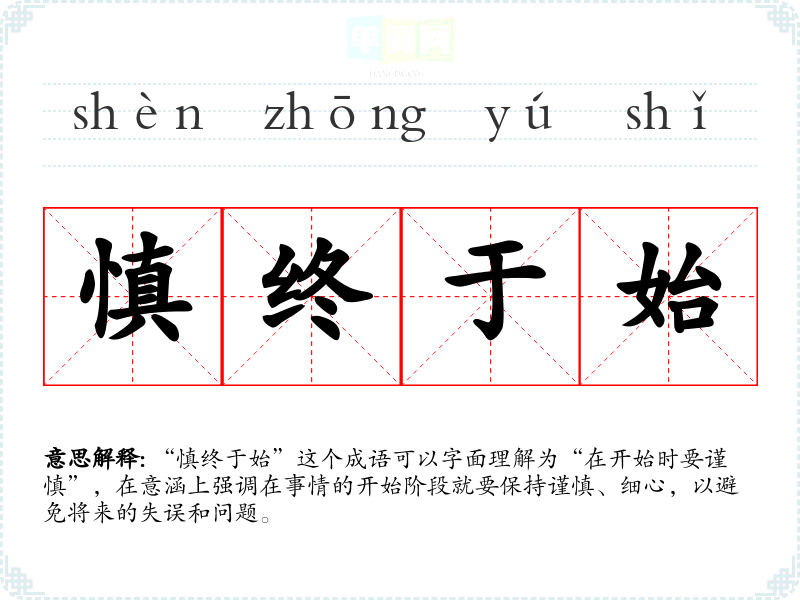“慎终于始”这个成语可以字面理解为“在开始时要谨慎”,在意涵上强调在事情的开始阶段就要保持谨慎、细心,以避免将来的失误和问题。