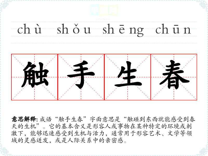 成语“触手生春”字面意思是“触碰到东西就能感受到春天的生机”。它的基本含义是形容人或事物在某种特定的环境或刺激下,能够迅速感受到生机与活力,通常用于形容艺术、文学等领域的灵感迸发,或是人际关系中的亲密感。