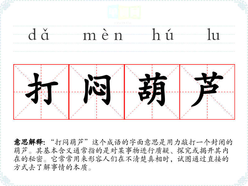 “打闷葫芦”这个成语的字面意思是用力敲打一个封闭的葫芦。其基本含义通常指的是对某事物进行质疑、探究或揭开其内在的秘密。它常常用来形容人们在不清楚真相时,试图通过直接的方式去了解事情的本质。