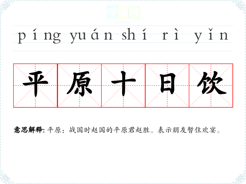 | 平原十日饮 | 平原:战国时赵国的平原君赵胜。表示朋友暂住欢宴。 |