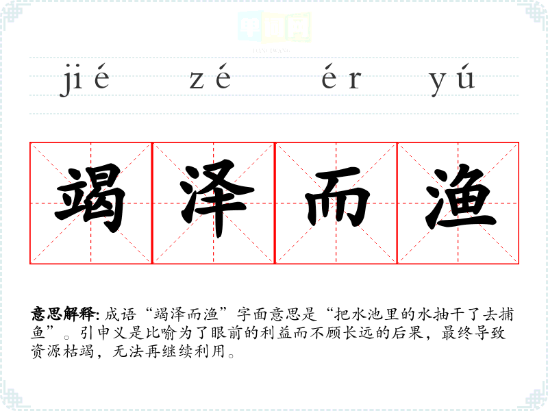 成语“竭泽而渔”字面意思是“把水池里的水抽干了去捕鱼”。引申义是比喻为了眼前的利益而不顾长远的后果,最终导致资源枯竭,无法再继续利用。