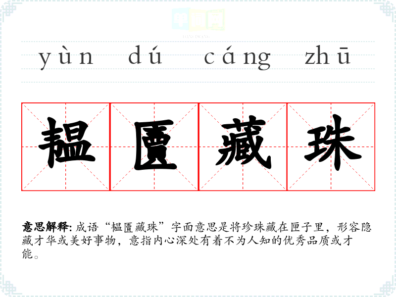 成语“韫匵藏珠”字面意思是将珍珠藏在匣子里,形容隐藏才华或美好事物,意指内心深处有着不为人知的优秀品质或才能。
