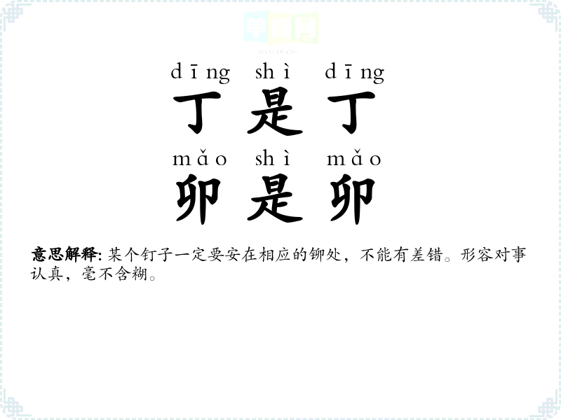 | 丁是丁,卯是卯 | 某个钉子一定要安在相应的铆处,不能有差错。形容对事认真,毫不含糊。 |