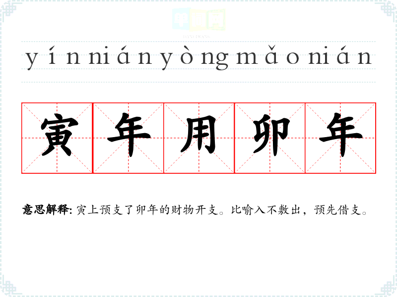 | 寅年用卯年 | 寅上预支了卯年的财物开支。比喻入不敷出,预先借支。 |