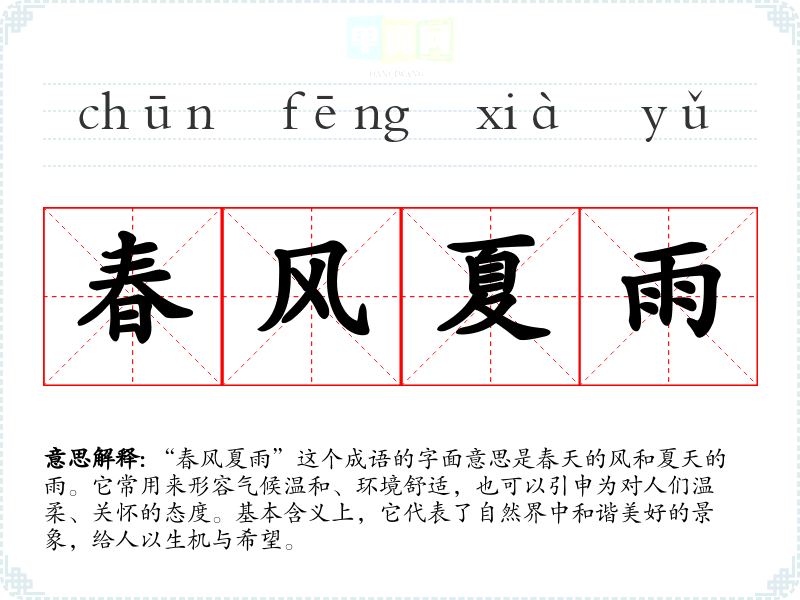 “春风夏雨”这个成语的字面意思是春天的风和夏天的雨。它常用来形容气候温和、环境舒适,也可以引申为对人们温柔、关怀的态度。基本含义上,它代表了自然界中和谐美好的景象,给人以生机与希望。