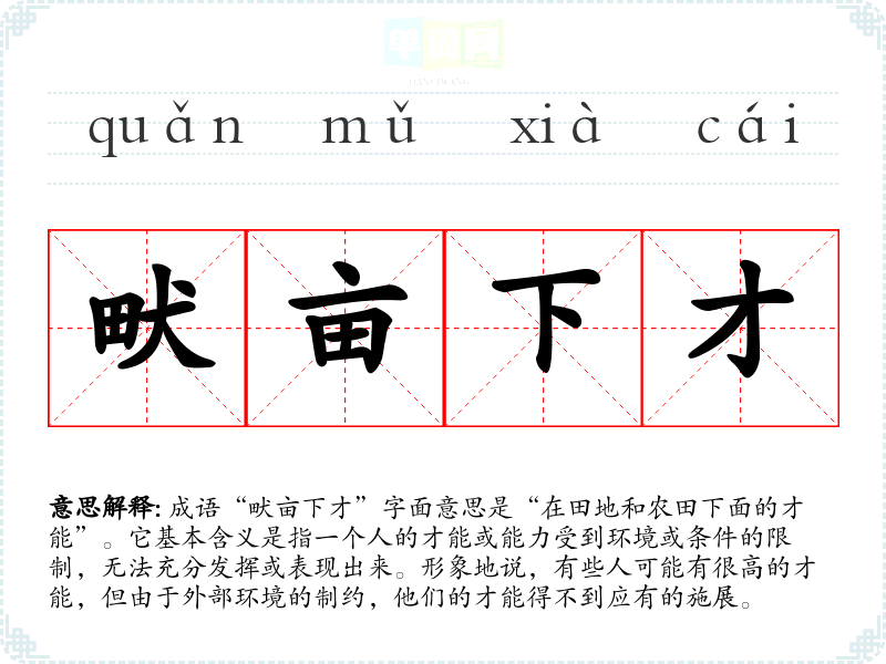 成语“畎亩下才”字面意思是“在田地和农田下面的才能”。它基本含义是指一个人的才能或能力受到环境或条件的限制,无法充分发挥或表现出来。形象地说,有些人可能有很高的才能,但由于外部环境的制约,他们的才能得不到应有的施展。