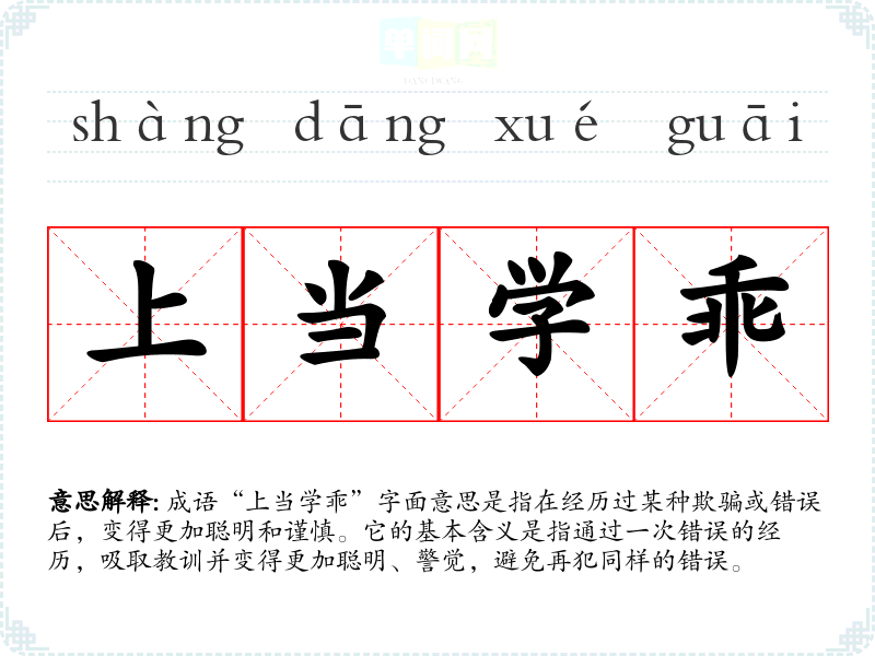 成语“上当学乖”字面意思是指在经历过某种欺骗或错误后,变得更加聪明和谨慎。它的基本含义是指通过一次错误的经历,吸取教训并变得更加聪明、警觉,避免再犯同样的错误。