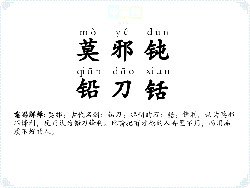 莫邪:古代名剑;铅刀:铅制的刀;铦:锋利。认为莫邪不锋利,反而认为铅刀锋利。比喻把有才德的人弃置不用,而用品质不好的人。