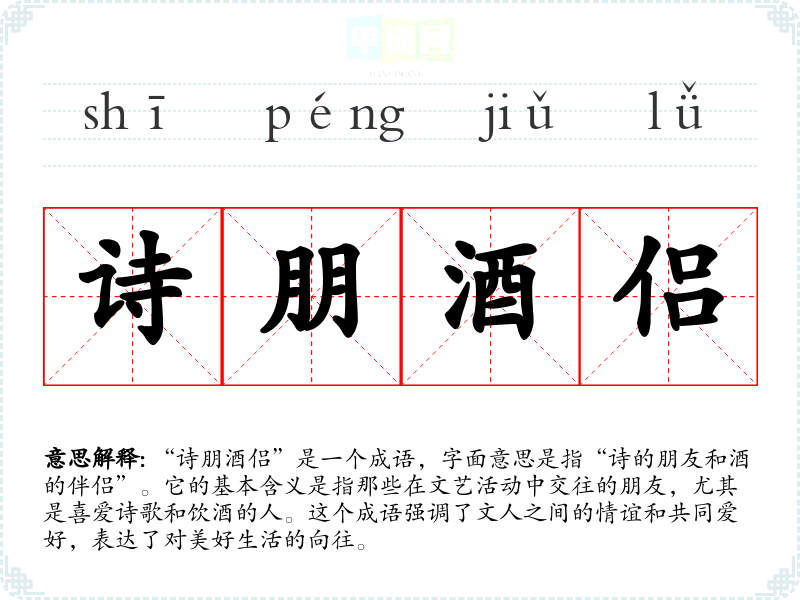 “诗朋酒侣”是一个成语,字面意思是指“诗的朋友和酒的伴侣”。它的基本含义是指那些在文艺活动中交往的朋友,尤其是喜爱诗歌和饮酒的人。这个成语强调了文人之间的情谊和共同爱好,表达了对美好生活的向往。