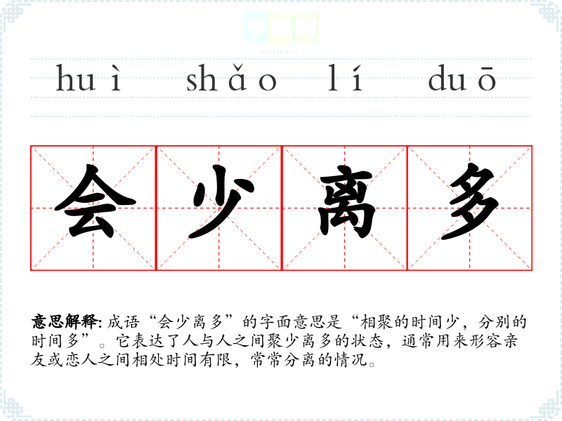 | 会少离多 | 相会少,别离多。感慨人生聚散无常或别离之苦。 |