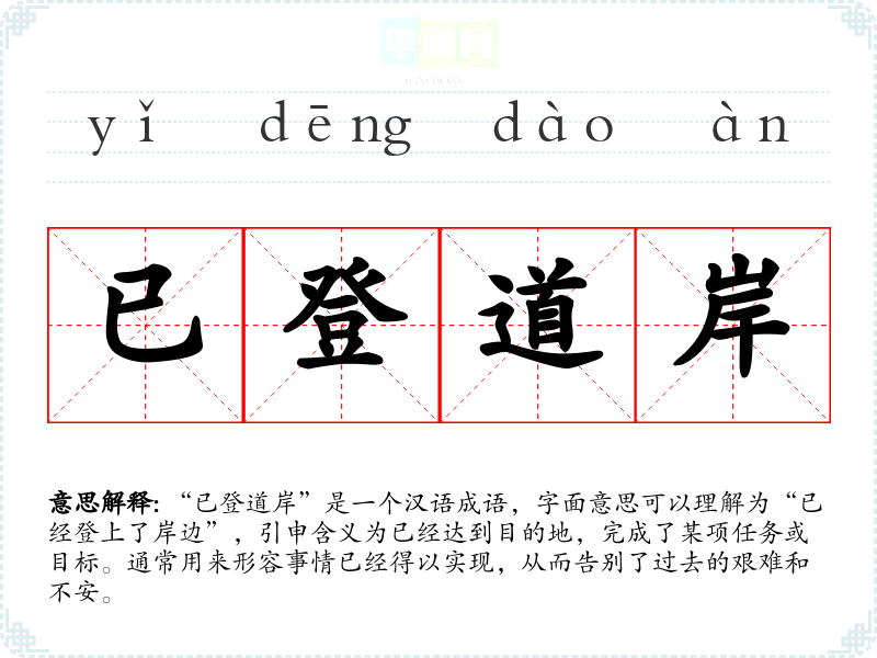 “已登道岸”是一个汉语成语,字面意思可以理解为“已经登上了岸边”,引申含义为已经达到目的地,完成了某项任务或目标。通常用来形容事情已经得以实现,从而告别了过去的艰难和不安。