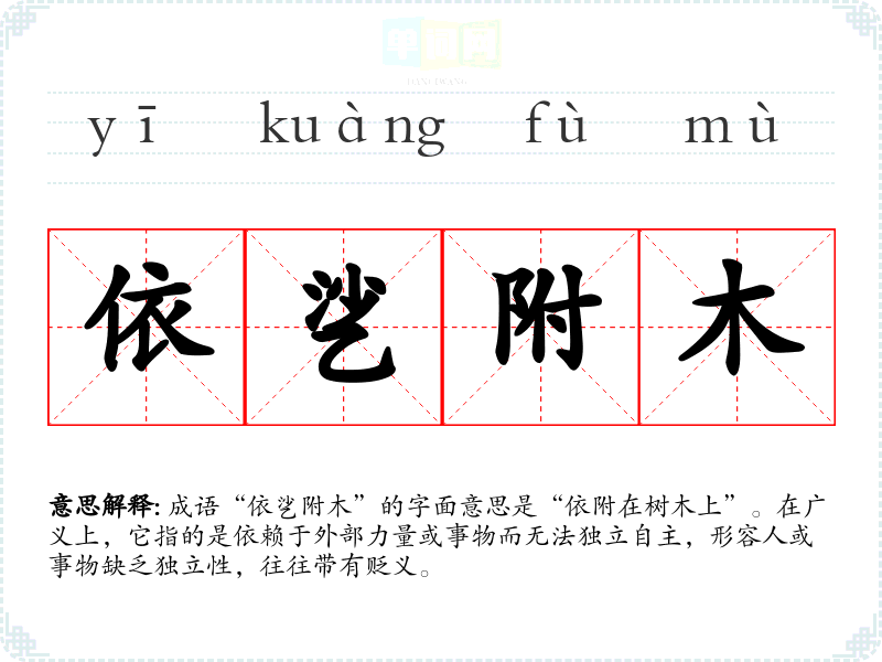 成语“依乷附木”的字面意思是“依附在树木上”。在广义上,它指的是依赖于外部力量或事物而无法独立自主,形容人或事物缺乏独立性,往往带有贬义。