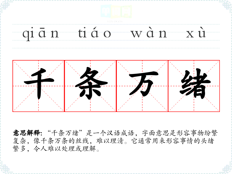 “千条万绪”是一个汉语成语,字面意思是形容事物纷繁复杂,像千条万条的丝线,难以理清。它通常用来形容事情的头绪繁多,令人难以处理或理解。