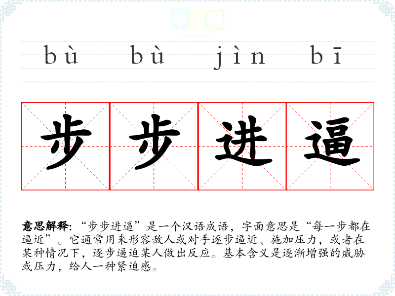 “步步进逼”是一个汉语成语,字面意思是“每一步都在逼近”。它通常用来形容敌人或对手逐步逼近、施加压力,或者在某种情况下,逐步逼迫某人做出反应。基本含义是逐渐增强的威胁或压力,给人一种紧迫感。