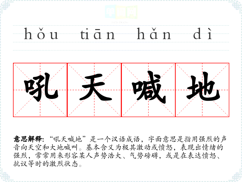 “吼天喊地”是一个汉语成语,字面意思是指用强烈的声音向天空和大地喊叫。基本含义为极其激动或愤怒,表现出情绪的强烈,常常用来形容某人声势浩大、气势磅礴,或是在表达愤怒、抗议等时的激烈状态。