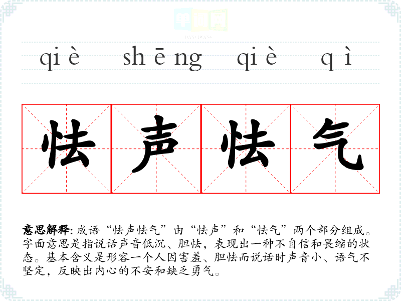 成语“怯声怯气”由“怯声”和“怯气”两个部分组成。字面意思是指说话声音低沉、胆怯,表现出一种不自信和畏缩的状态。基本含义是形容一个人因害羞、胆怯而说话时声音小、语气不坚定,反映出内心的不安和缺乏勇气。