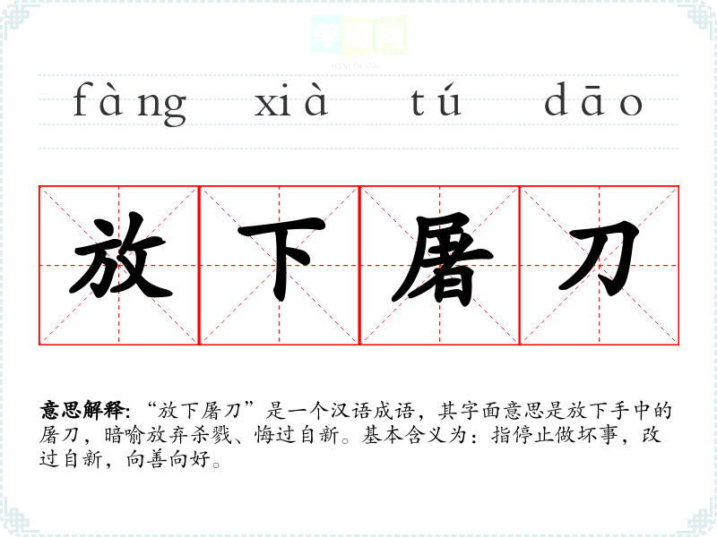 “放下屠刀”是一个汉语成语,其字面意思是放下手中的屠刀,暗喻放弃杀戮、悔过自新。基本含义为:指停止做坏事,改过自新,向善向好。