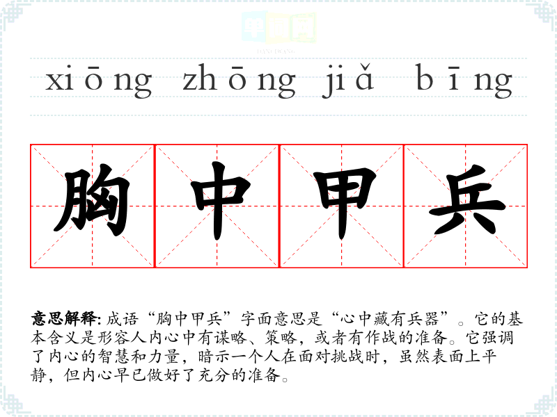在文学作品中,“胸中甲兵”常用来形容那些智勇双全的人物。比如在古典小说中,智者在关键时刻展现的智慧,或是军队指挥官在战斗前的深思熟虑。在日常对话中,可以用来形容某人在面对复杂问题时的从容不迫。而在演讲中,这个成语可以用来激励听众,强调内心准备的重要性。