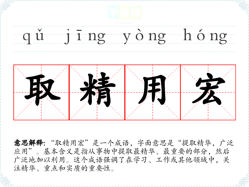 | 取精用宏 | 用:享受。从大量材料中选取精华充分加以运用。 |