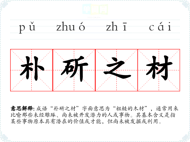 成语“朴斫之材”字面意思为“粗糙的木材”,通常用来比喻那些未经雕琢、尚未被开发潜力的人或事物。其基本含义是指某些事物原本具有潜在的价值或才能,但尚未被发掘或利用。