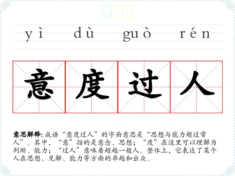 - 文学作品:在描述一个人物的才华和智慧时,可以用“意度过人”来强调其卓越。