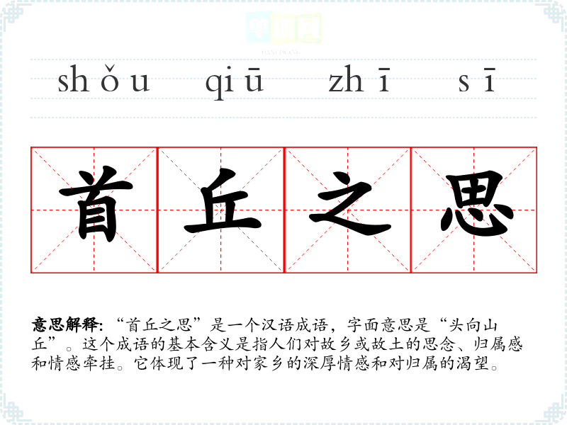 “首丘之思”是一个汉语成语,字面意思是“头向山丘”。这个成语的基本含义是指人们对故乡或故土的思念、归属感和情感牵挂。它体现了一种对家乡的深厚情感和对归属的渴望。